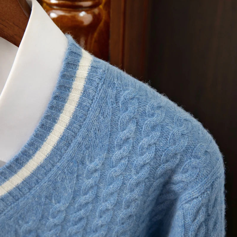 BeClassic™ 100% Wool V-Neck Sweater – Thick Color-Blocked Knit with Timeless Twisted Detailing.